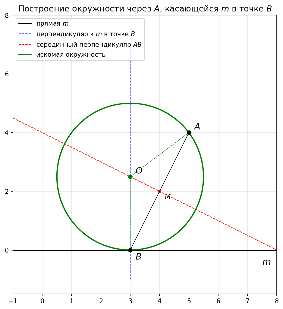 Замечание. Если точка A лежит на прямой m (и A ≠ B), то серединный перпендикуляр отрезка AB параллелен перпендикуляру к m в точке B, и задача не имеет решения. Если A = B, то любая окружность, касающаяся m в точке B, является решением. В остальных случаях (когда A не лежит на m) задача имеет единственное решение.