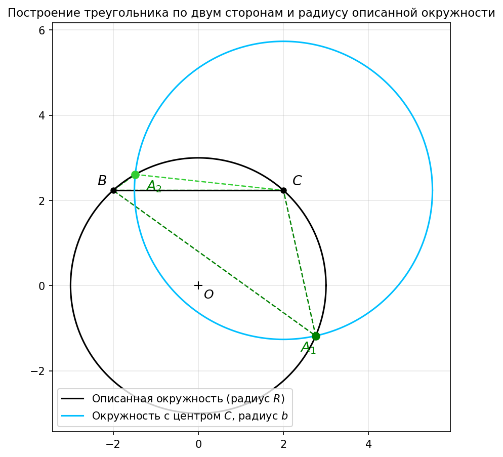 Две окружности (описанная окружность радиуса R и окружность с центром C радиуса b) могут пересекаться по-разному. При этом точку B (если она попадает в пересечение) нужно исключить, так как она не даёт треугольника. Поэтому: