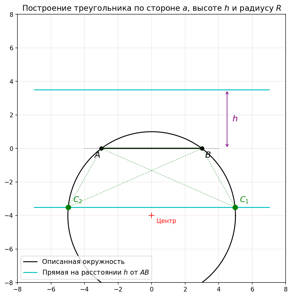 Каждая из полученных точек пересечения даёт искомый треугольник ABC, в котором сторона AB = a, высота из C на AB равна h, а треугольник вписан в окружность радиуса R.