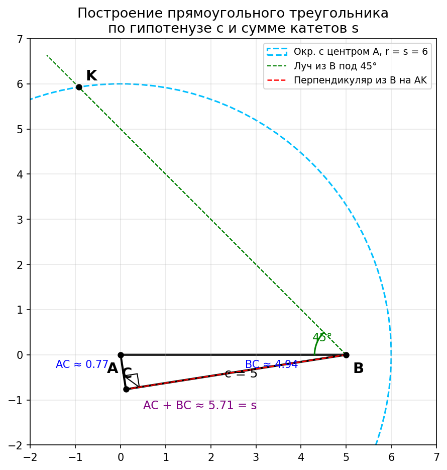 Тогда в треугольнике BKC: ∠ BKC = 45°, ∠ BCK = 90°, значит ∠ KBC = 45°, и треугольник BKC равнобедренный, BC = KC. Поэтому AC + BC = AC + KC = AK = s. А ∠ ACB = 90° по построению.