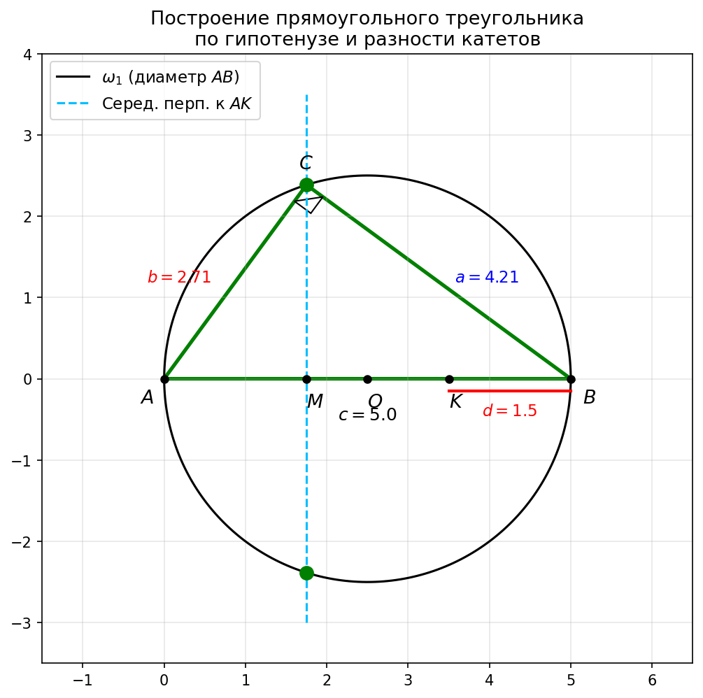 Треугольник ABC — искомый, так как ∠ ACB = 90° (вписанный угол, опирающийся на диаметр), AB = c, и BC - AC = d.