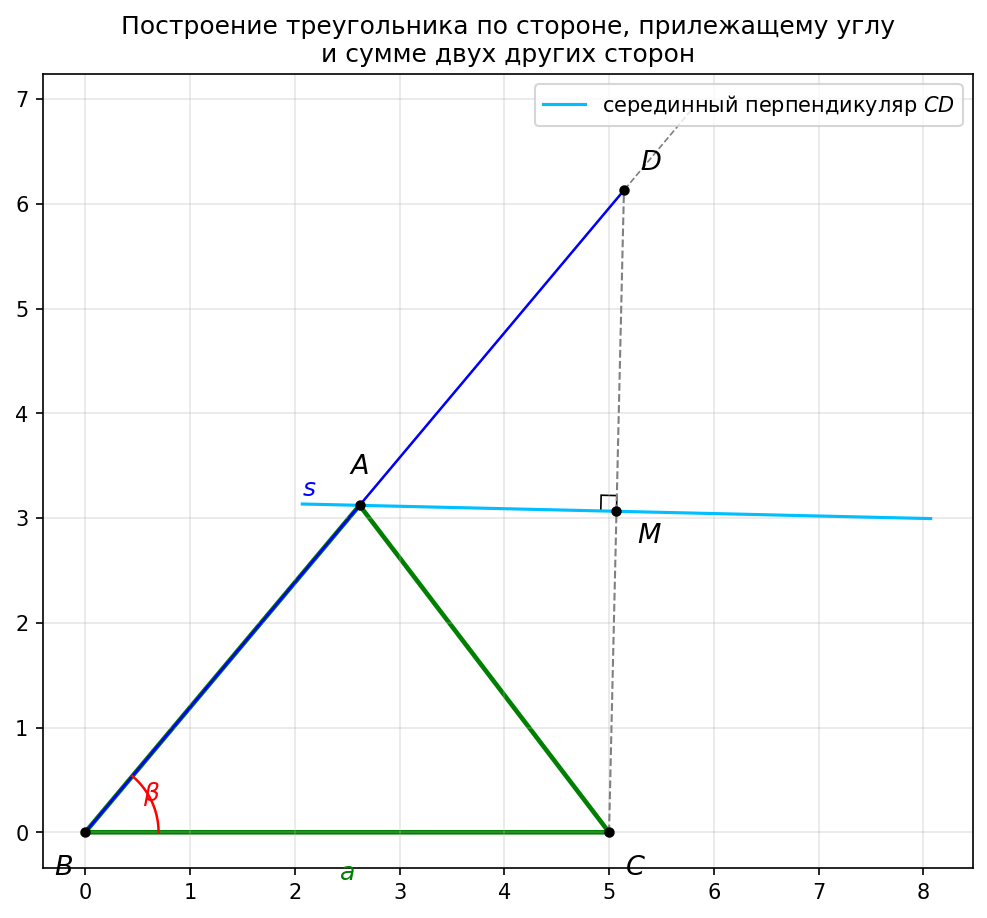 Полученный треугольник ABC является искомым, так как BC = a, ∠ ABC = β, а поскольку A лежит на серединном перпендикуляре CD, то AC = AD, откуда AB + AC = AB + AD = BD = s.