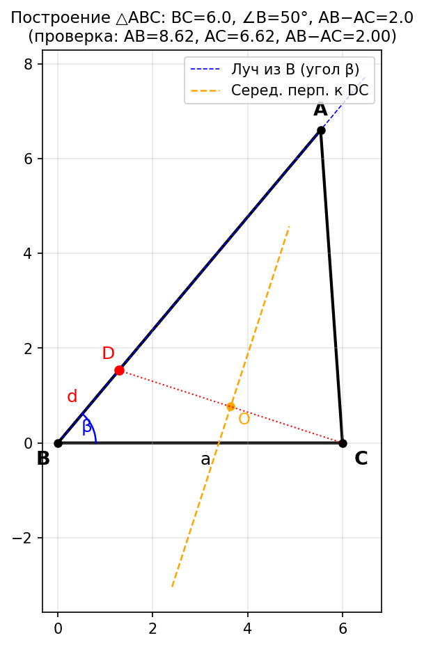 Полученный треугольник ABC является искомым, так как в нём BC = a, ∠ B = β, а AB - AC = AB - DA = BD = d.