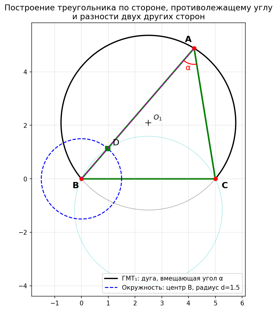 - Проводим луч BD и на нём строим дугу ГМТ₁ — пересечение луча BD с дугой ГМТ₁ даёт вершину A.