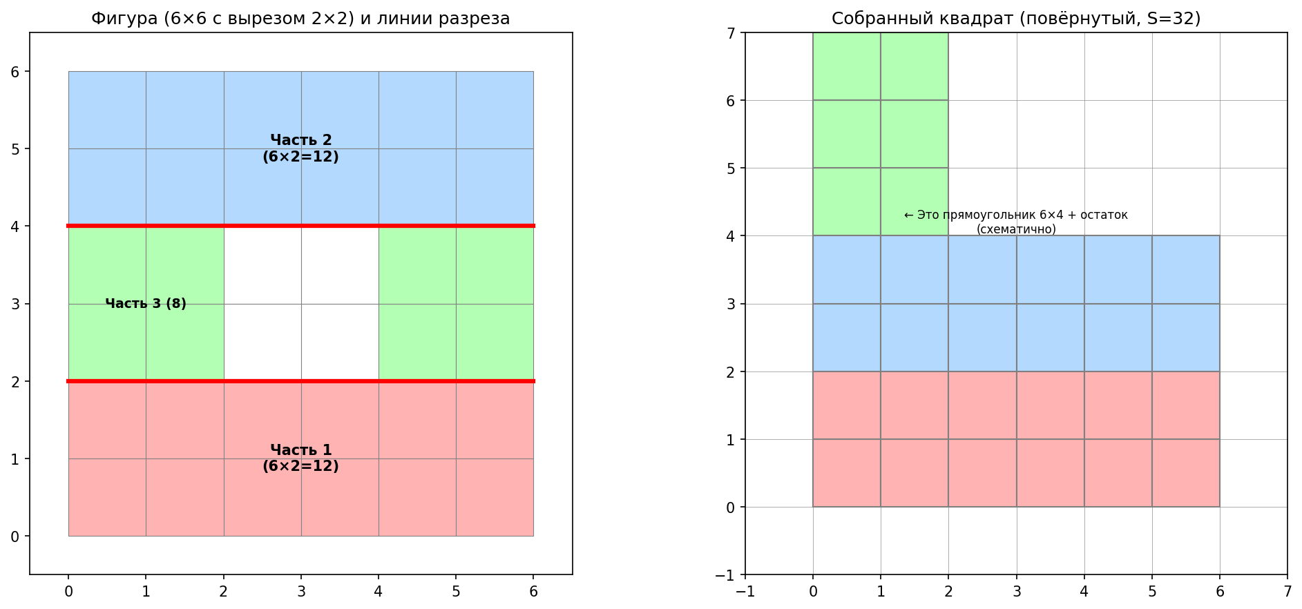 Переложив эти три части, получаем квадрат площадью 32.