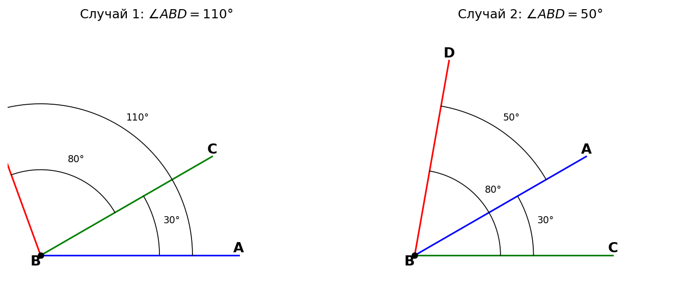 Условие: Угол $ABC$ равен $30°$, угол $CBD$ — $80°$. Найдите угол $ABD$. Сколько решений имеет задача?