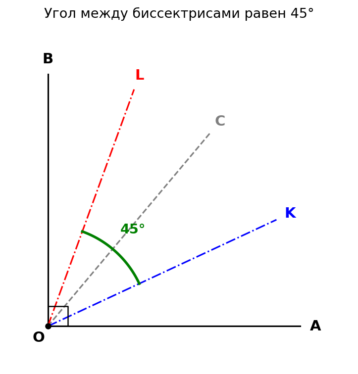 Условие: Луч, проведённый из вершины прямого угла, делит его на два угла. Докажите, что угол между биссектрисами образовавшихся углов равен $45°$.