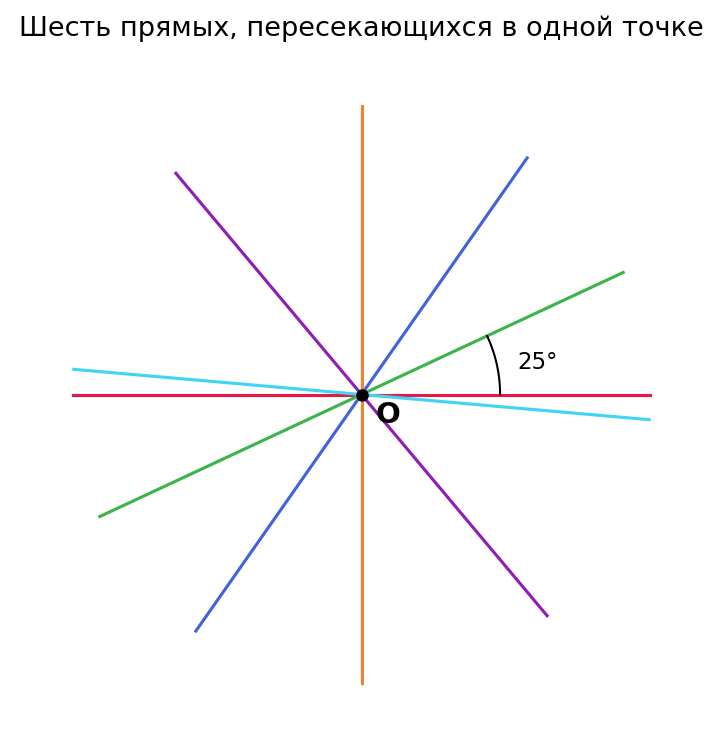 Шесть прямых, пересекающихся в одной точке, образуют 12 лучей с общим началом в этой точке. Эти 12 лучей делят развёрнутый угол (полный оборот 360°) на 12 углов.