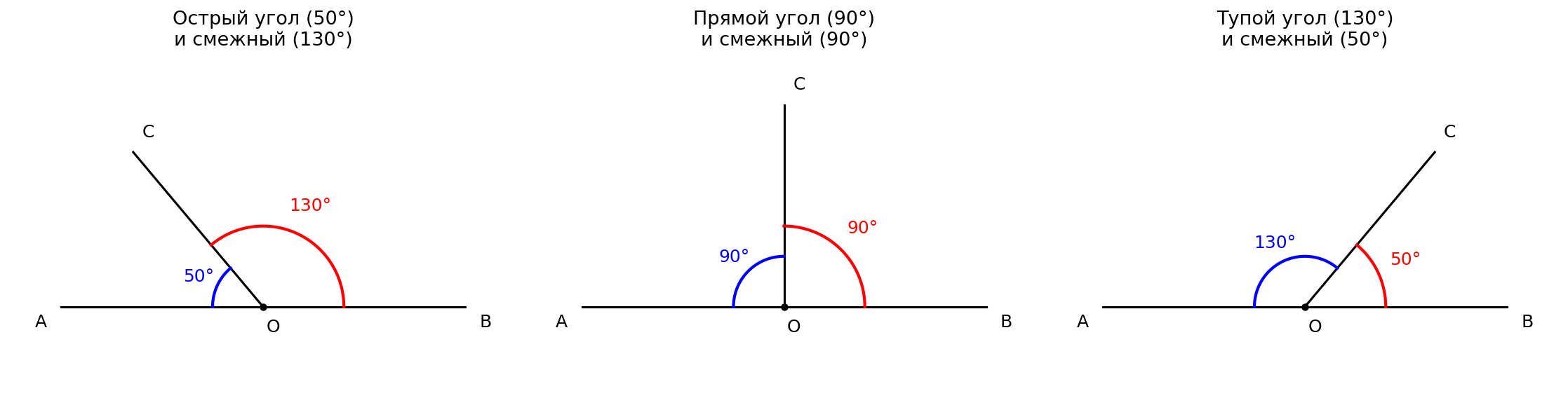 - Тупой угол (например, 130°) — смежный с ним угол равен 180° - 130° = 50° (острый).