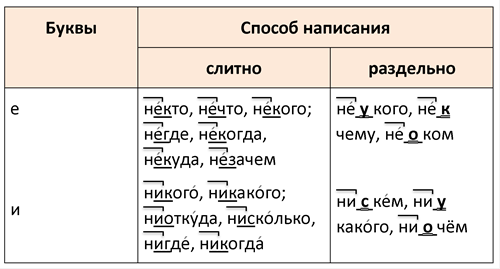 В отрицательных местоимениях и наречиях под ударением пишется приставка не-: не́кто, не́что; не́где, не́когда, не́куда. В безударном положении пишется приставка ни-: ничему́, никого́; ниотку́да, ниско́лько, нигде́. Случаи, требующие запоминания: никак, нисколечко, ничуть, нимало (=ничуть), немало (=много).