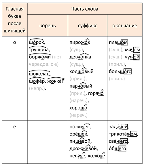 гласные о/е после шипящих в суффиксах существительных, прилагательных и наречий,