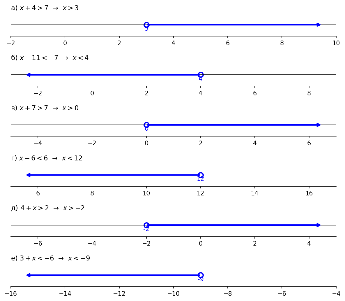 г) $x - 6 < 6$; д) $4 + x > 2$; е) $3 + x < -6$.