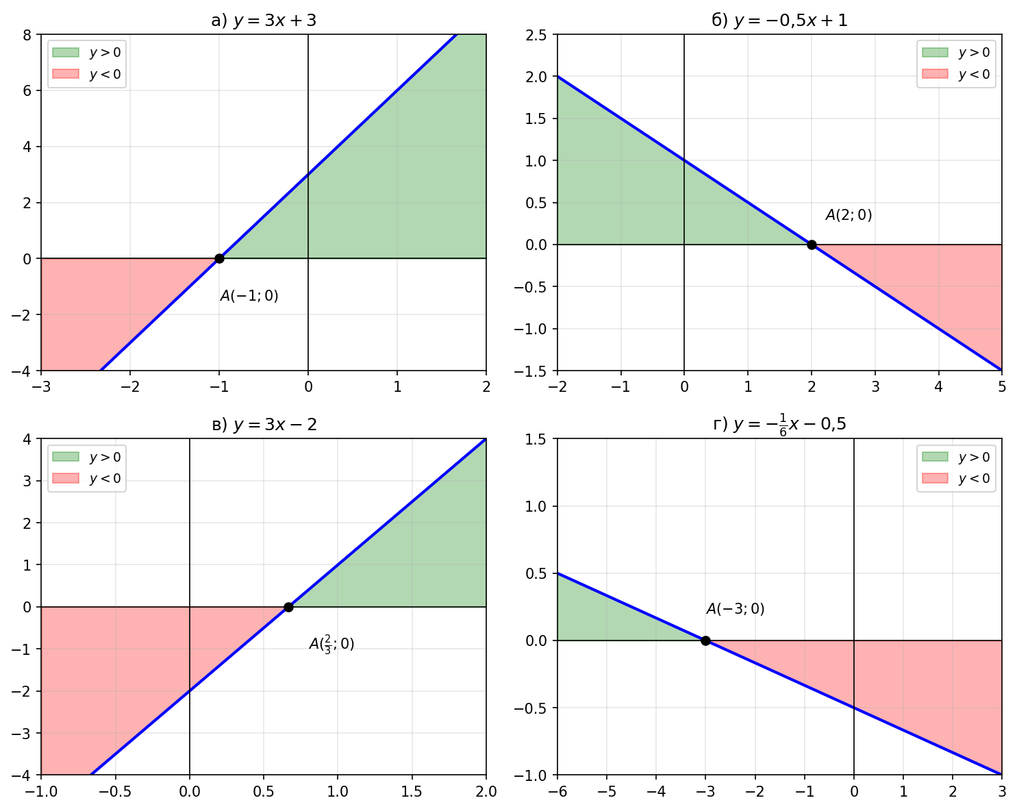 Для каждого графика найдём точку пересечения прямой с осью \(Ox\) (где \(y = 0\)) и определим знак углового коэффициента \(k\). Затем по графику установим, на каких интервалах функция положительна (\(y > 0\), т.е. график выше оси \(Ox\)) и отрицательна (\(y < 0\), т.е. график ниже оси \(Ox\)).