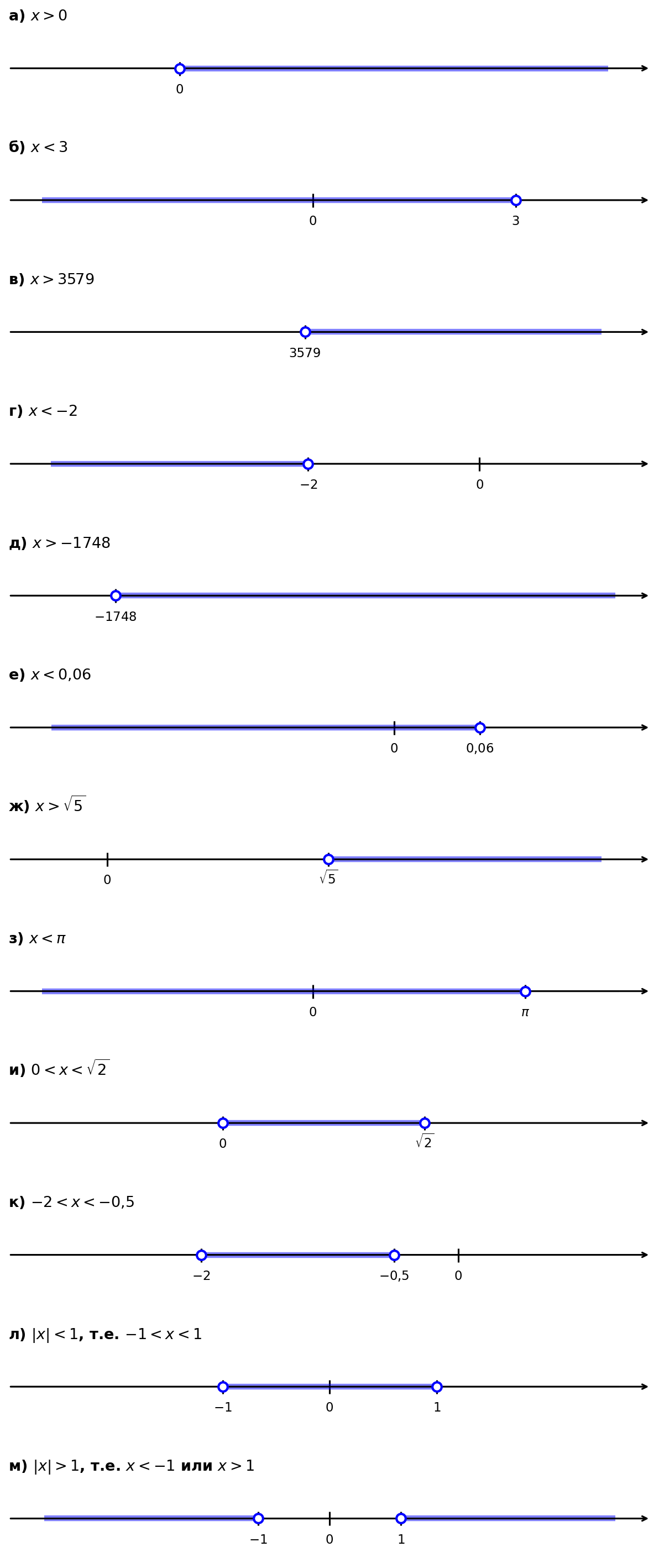 а) \(x > 0\) — все числа правее нуля: интервал \((0; +\infty)\).