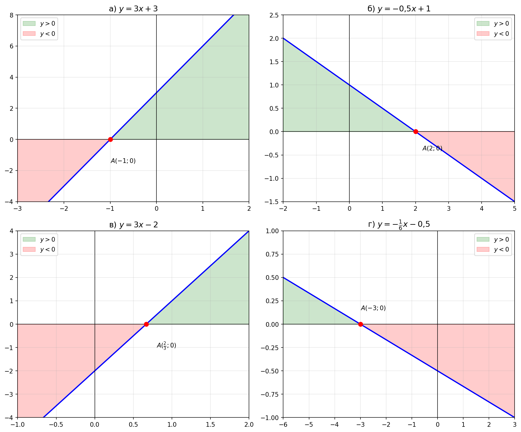 Для каждого графика найдём точку пересечения прямой с осью \(Ox\) (где \(y = 0\)) и определим знак углового коэффициента \(k\). Затем по графику установим, на каких интервалах функция положительна (\(y > 0\), т.е. график выше оси \(Ox\)) и отрицательна (\(y < 0\), т.е. график ниже оси \(Ox\)).
