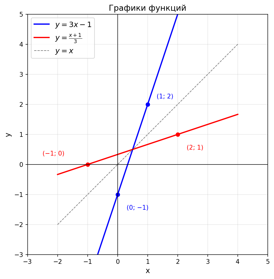 Условие: Постройте график функции $y = 3x - 1$. Замените $x$ на $y$, а $y$ на $x$ и постройте график полученной функции в той же системе координат.