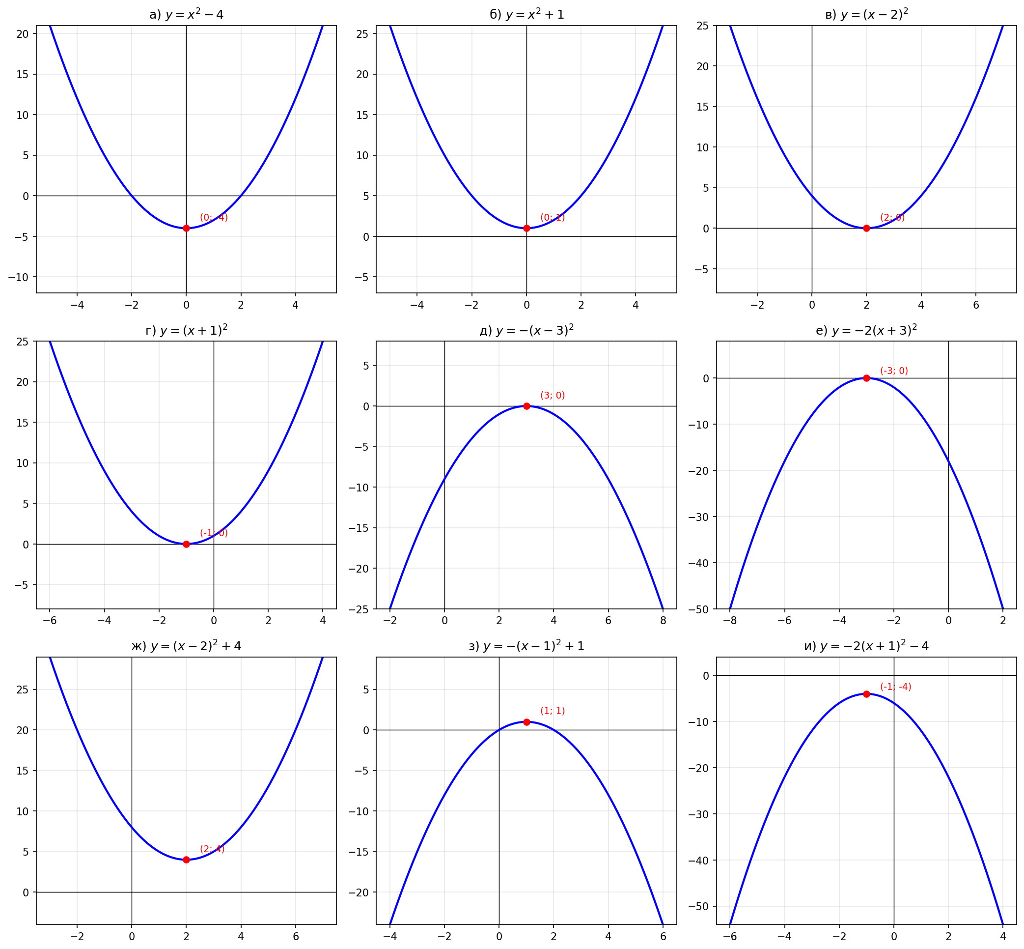 д) — сдвиг на 3 вправо, ветви вниз. Вершина
