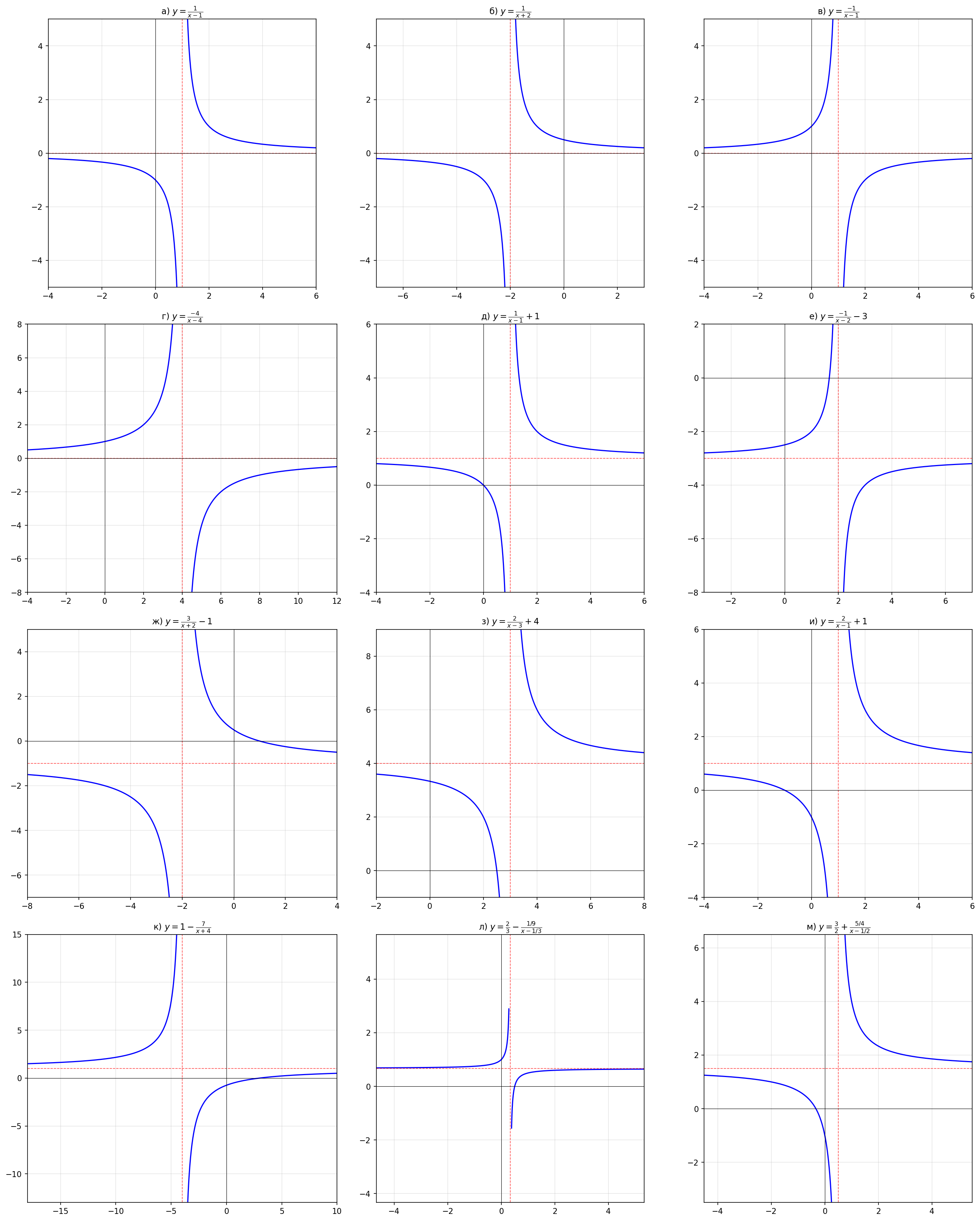 Каждый график представляет собой гиперболу с центром симметрии в точке — пересечении асимптот (показаны пунктиром).