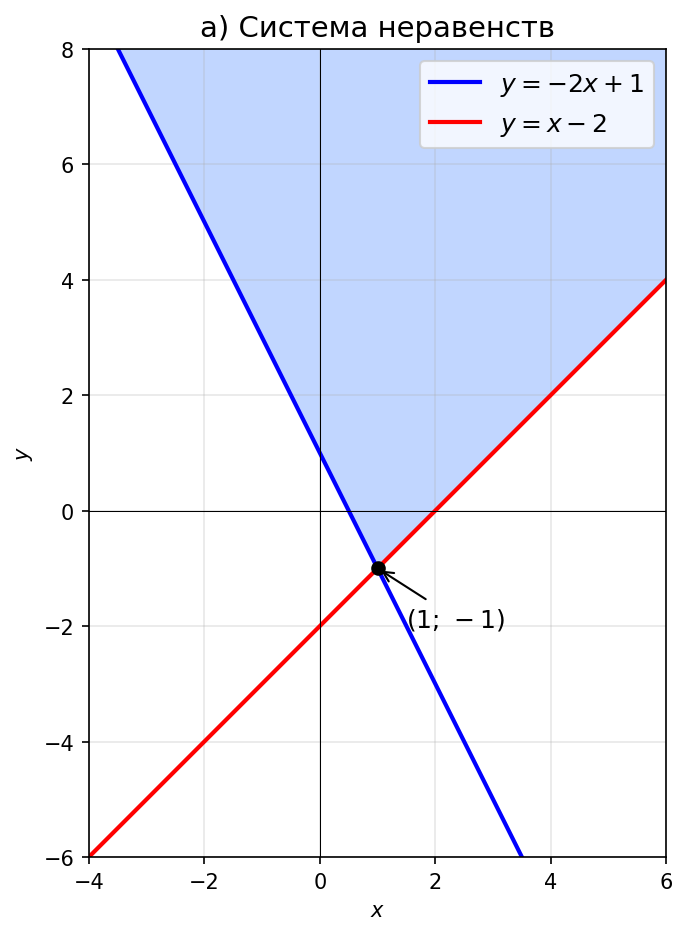 Ответ: заштрихована область выше обеих прямых — «угол» с вершиной , раскрытый вверх.