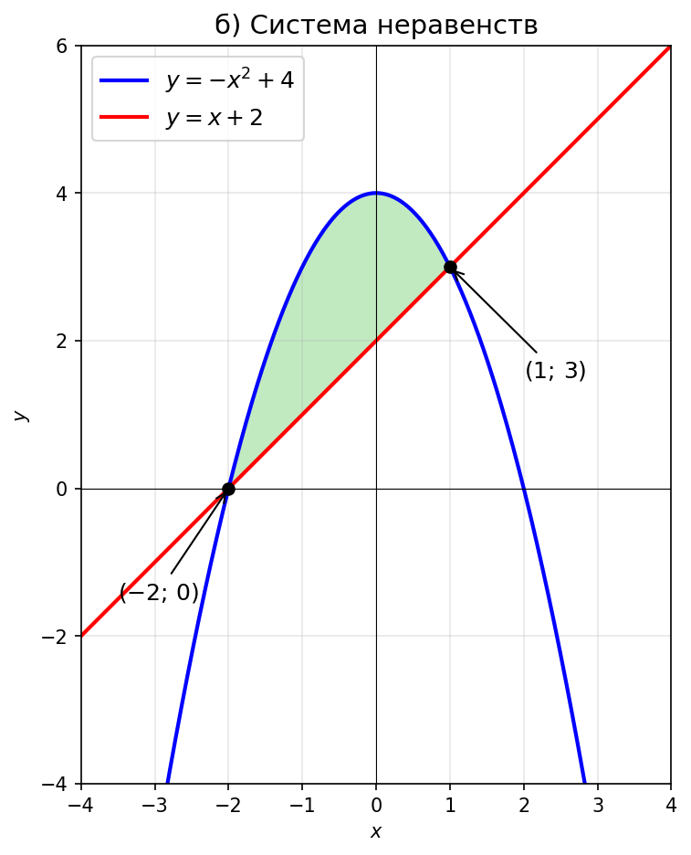 Первое неравенство — область на и под параболой (ветви вниз, вершина