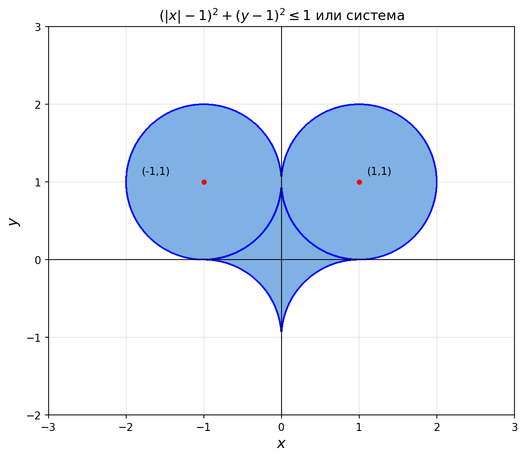 Первое неравенство — это внешность кругов радиуса 1 с центрами