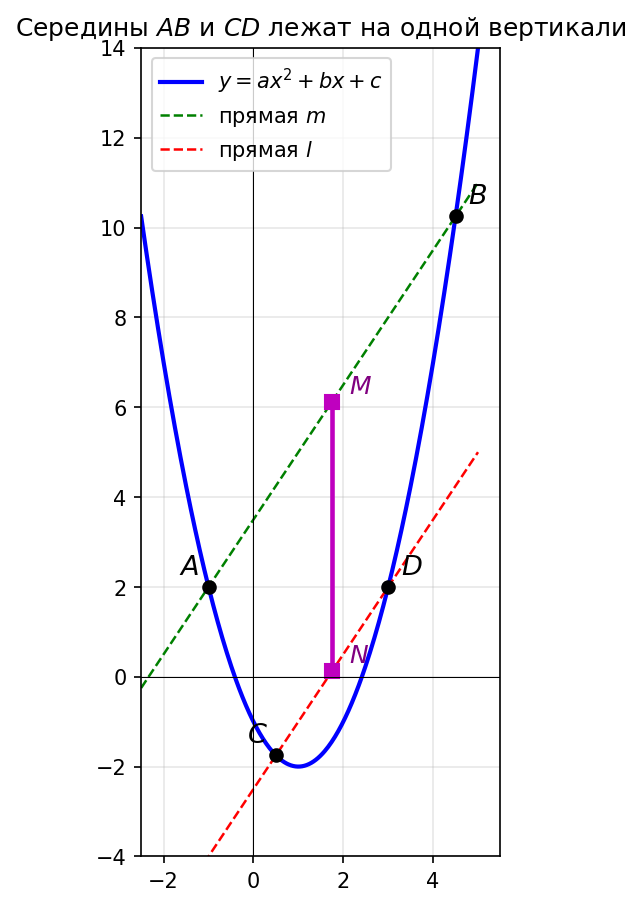 Условие: На рисунке 93 изображены парабола $y = ax^2 + bx + c$ и параллельные прямые $m$ и $l$, пересекающие параболу в точках $A$ и $B$, $C$ и $D$ соответственно. Докажите, что прямая, проходящая через середины отрезков $AB$ и $CD$, параллельна оси $Oy$.
