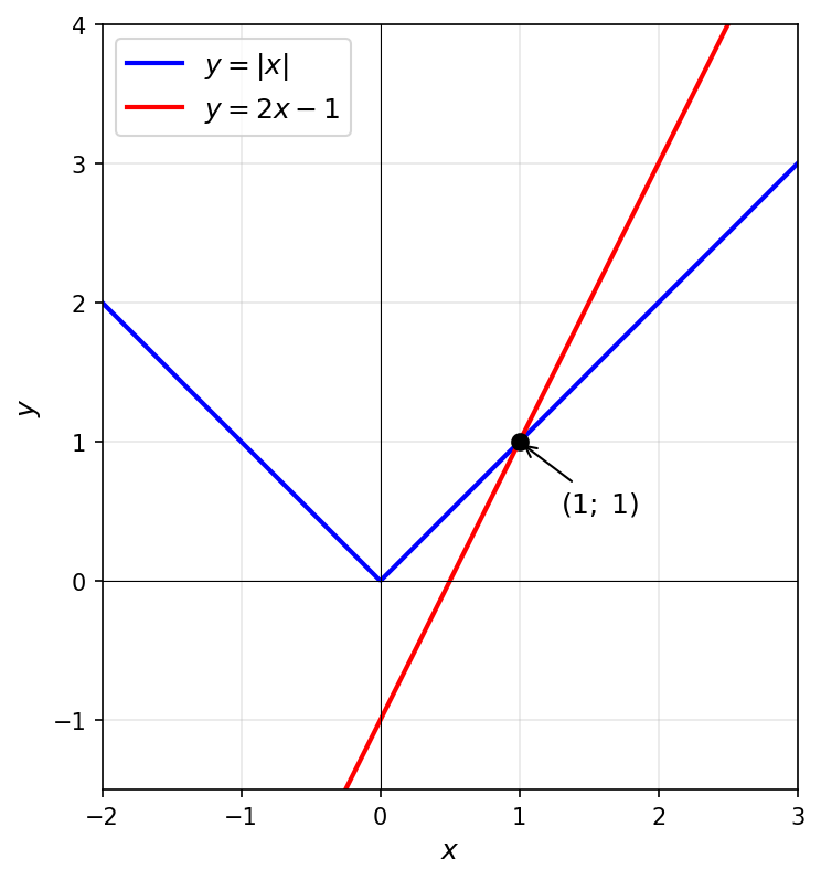 Условие: Найдите значение аргумента, при котором значения функций $y = |x|$ и $y = 2x - 1$ равны между собой.