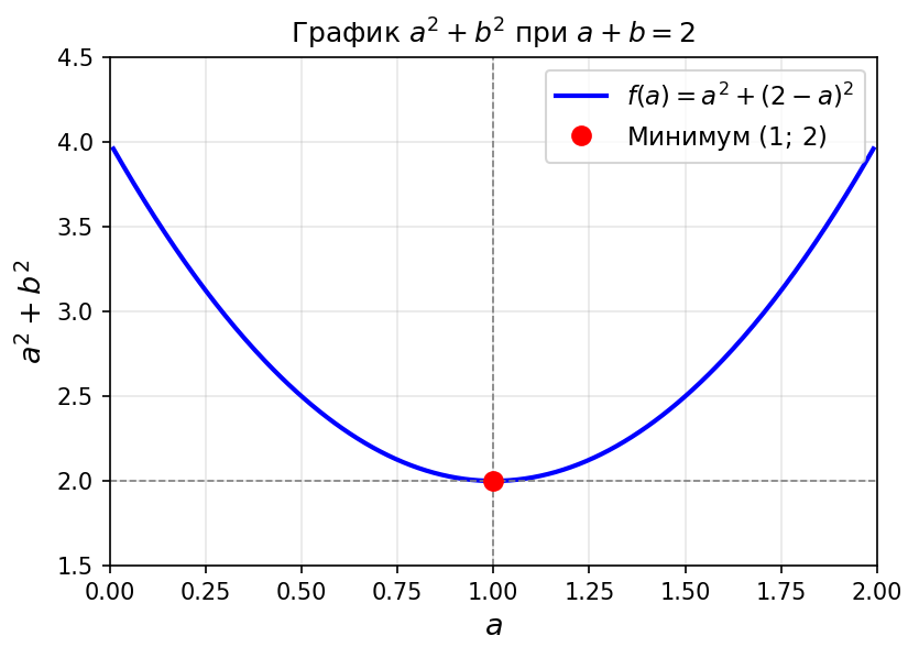 Условие: Какое наименьшее значение может принять выражение $a^2 + b^2$, если $a > 0$, $b > 0$, $a + b = 2$?