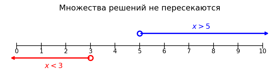 Таким образом, из того, что система двух линейных неравенств не имеет решений, не следует, что каждое неравенство системы не выполняется ни при каких значениях неизвестного. Каждое неравенство может иметь решения, но их множества решений не пересекаются.