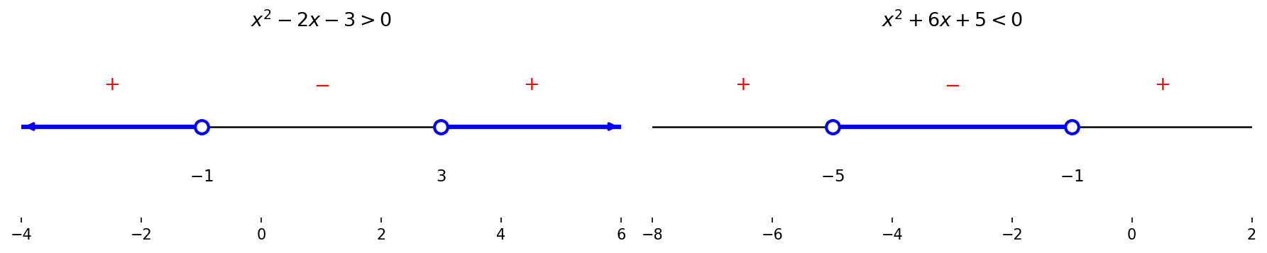 Правый график: числовая ось с кружками при $x = -5$ и $x = -1$; штриховка между $-5$ и $-1$; знаки: $+$ левее $-5$, $-$ между $-5$ и $-1$, $+$ правее $-1$. Множество решений: $-5 < x < -1$, неравенство $(x+5)(x+1) < 0$, то есть $x^2 + 6x + 5 < 0$.