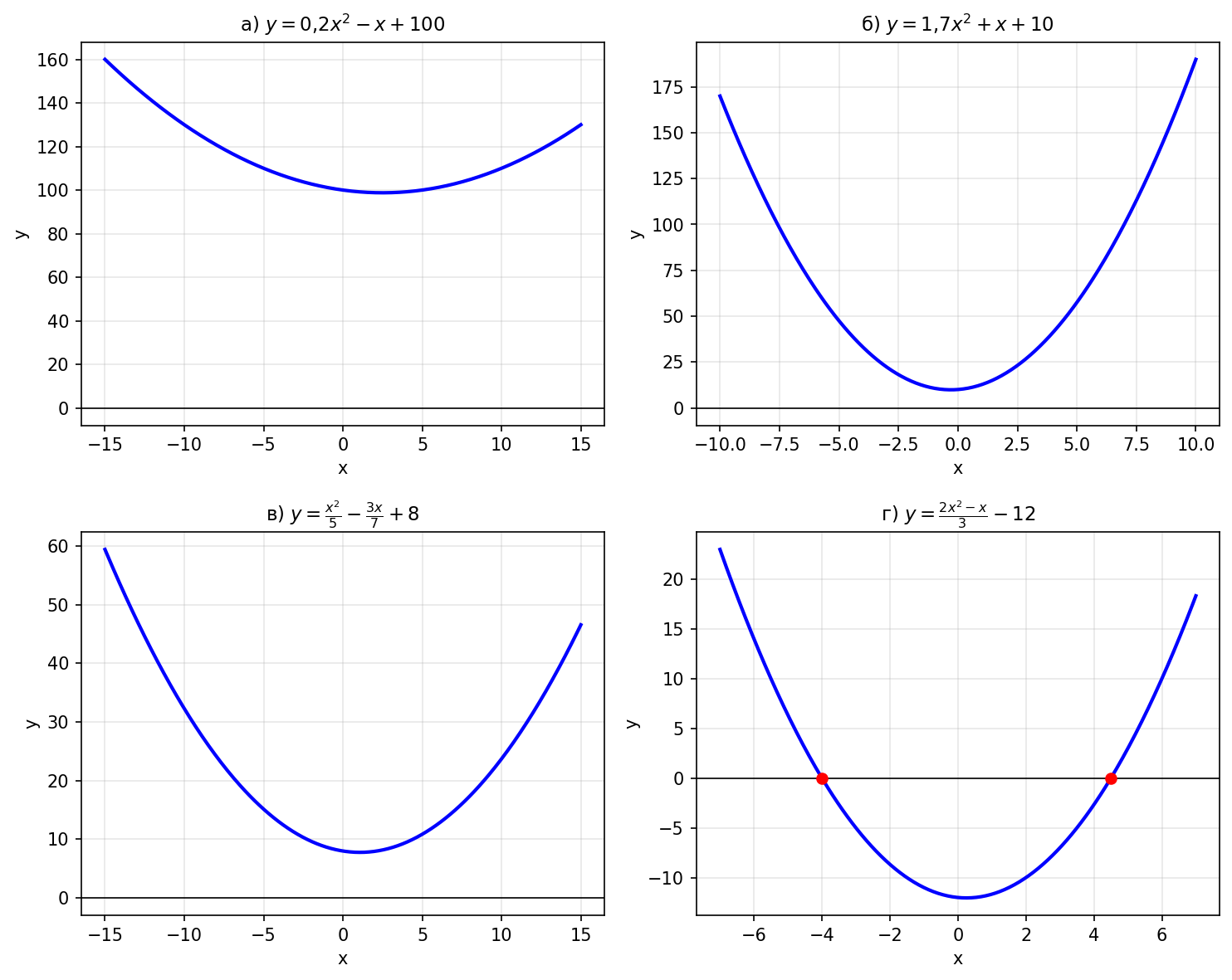 в) $\dfrac{x^2}{5} - \dfrac{3x}{7} + 8 < 0$;
