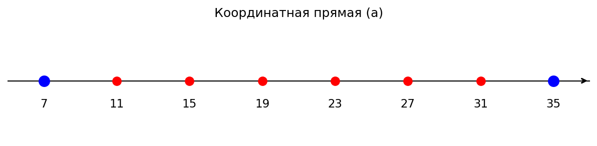 Условие: а) Между числами 7 и 35 на координатной прямой найдите шесть точек, координаты которых вместе с числами 7 и 35 являются последовательными членами арифметической прогрессии.