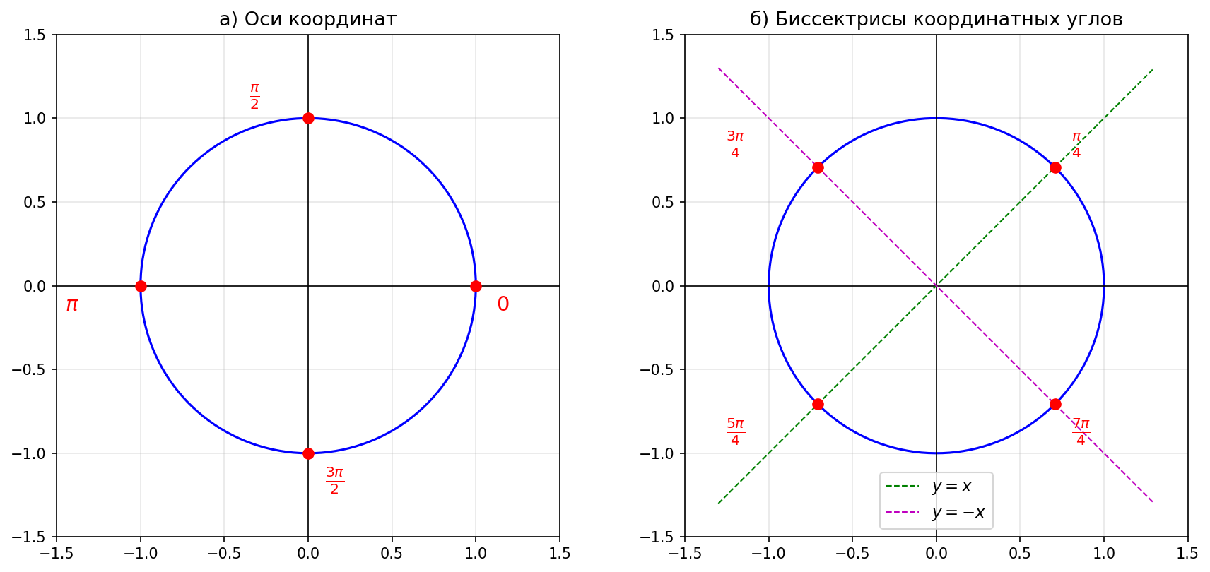 б) Пересечение единичной окружности с биссектрисами координатных углов