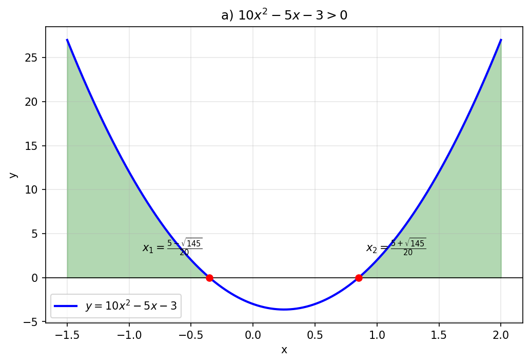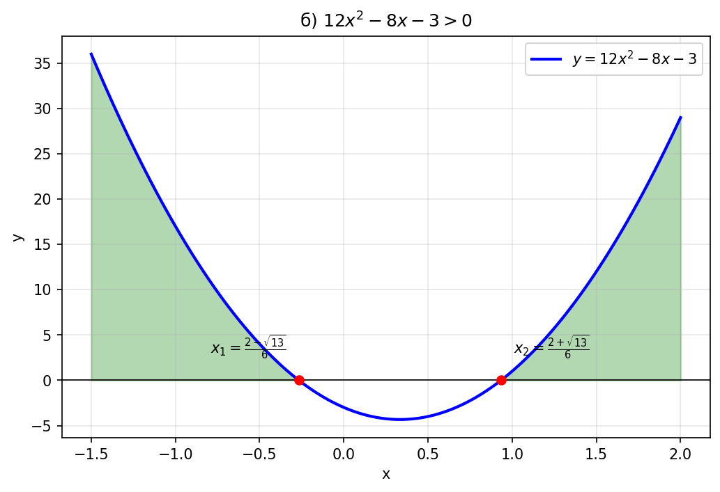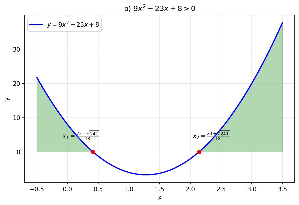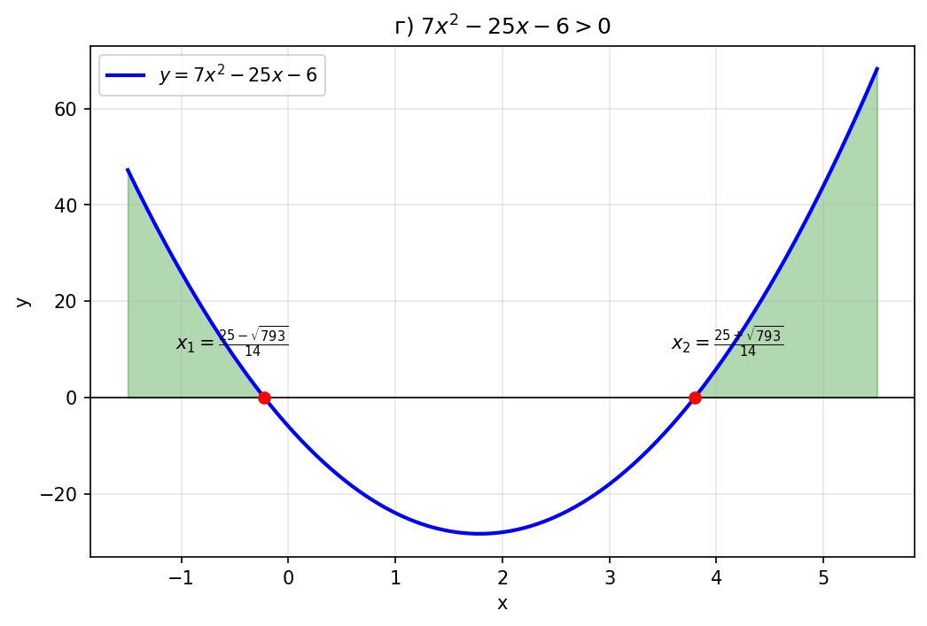 Коэффициент при положителен, значит парабола направлена вверх и выражение положительно вне корней.