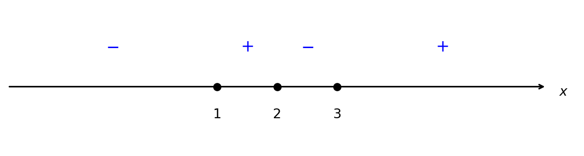 Условие: На координатной оси отмечены числа 1, 2 и 3. Определите знаки каждого двучлена $x - 1$, $x - 2$, $x - 3$ и знак выражения $(x - 1)(x - 2)(x - 3)$ на интервалах $(-\infty; 1)$, $(1; 2)$, $(2; 3)$, $(3; +\infty)$.