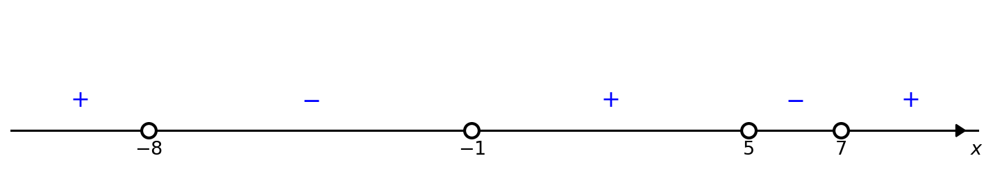 в) $\dfrac{(x+1)(7-x)}{(8+x)(x-5)} < 0$;