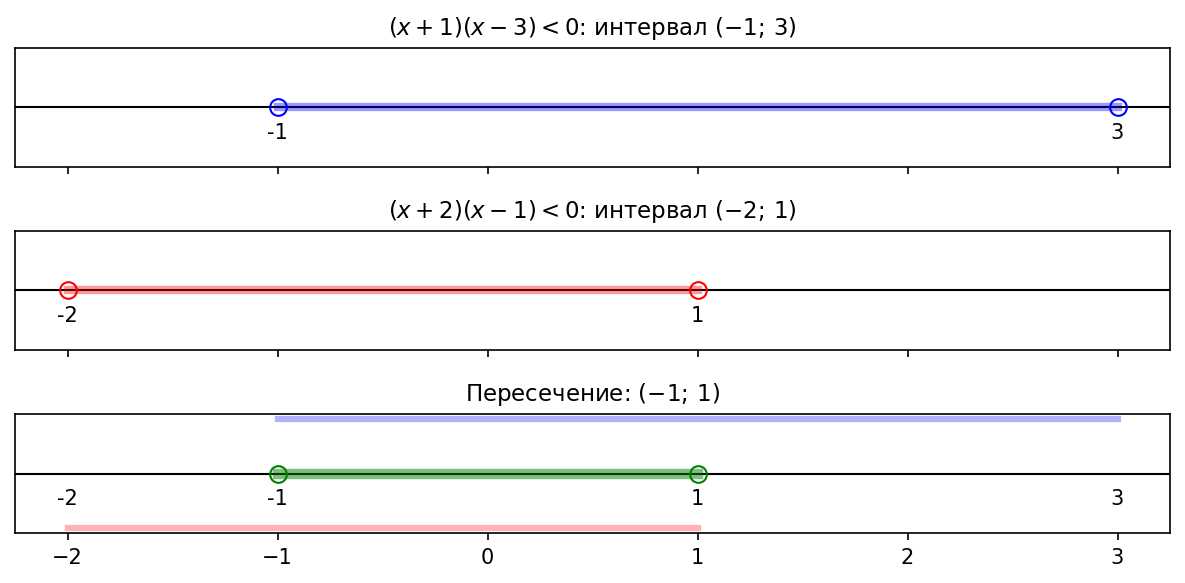 а) $\begin{cases} (x+1)(x-3) < 0, \\ (x+2)(x-1) < 0; \end{cases}$