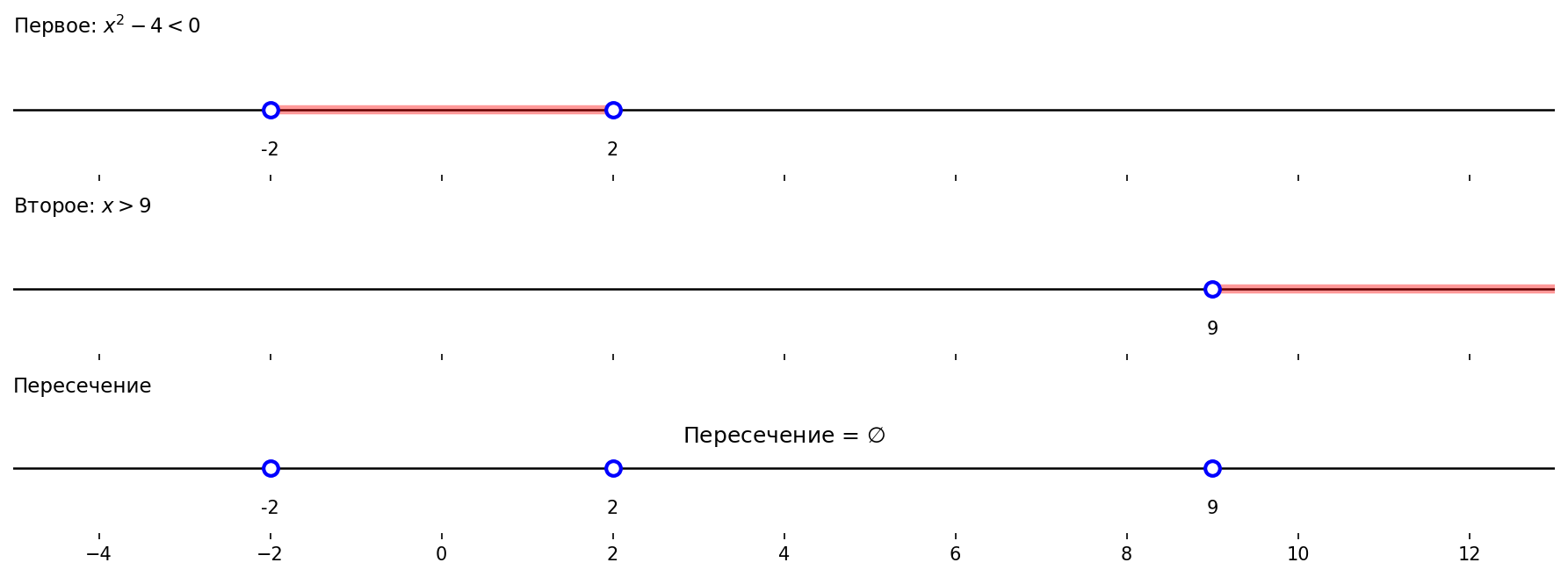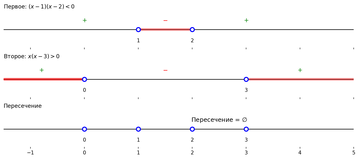 Первое неравенство. Методом интервалов: корни 1 и 2.