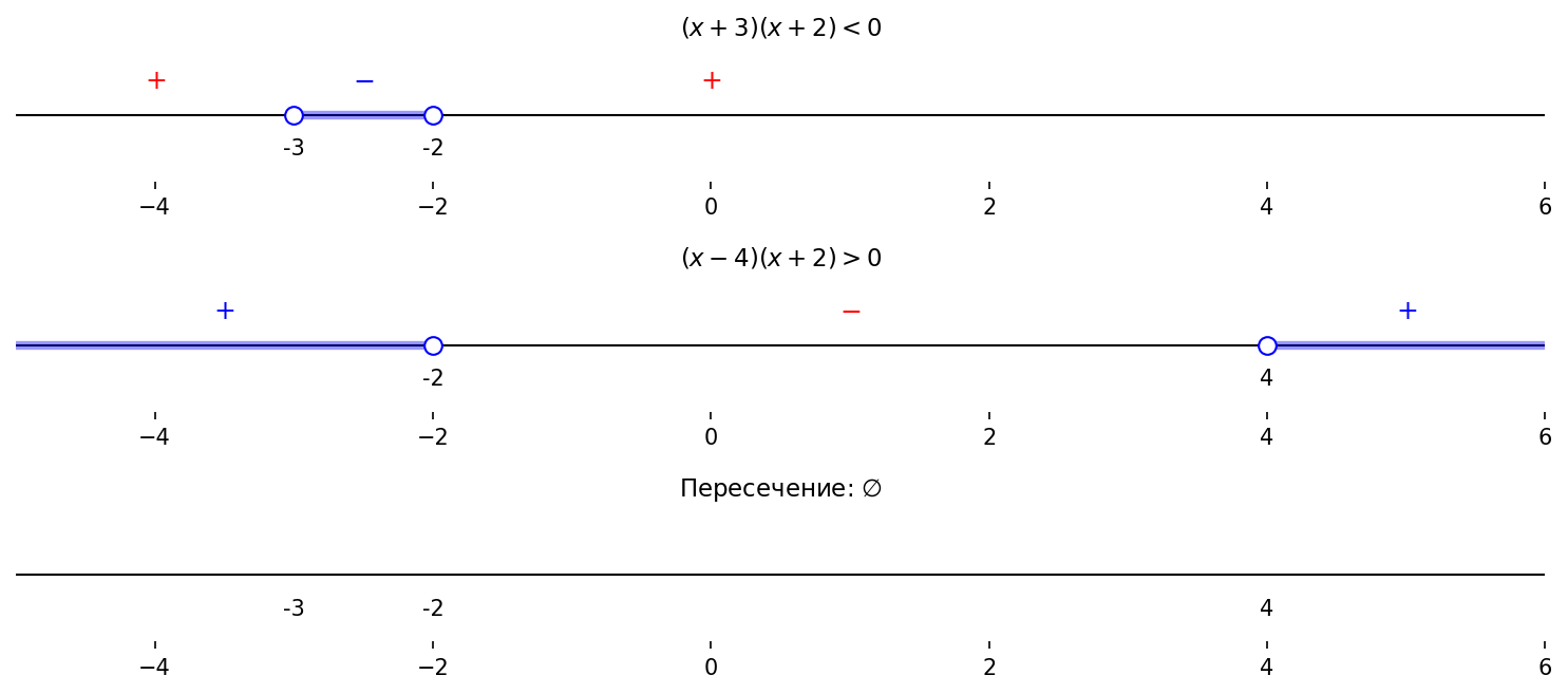 б) $\begin{cases} (x+3)(x+2) < 0, \\ (x-4)(x+2) > 0; \end{cases}$