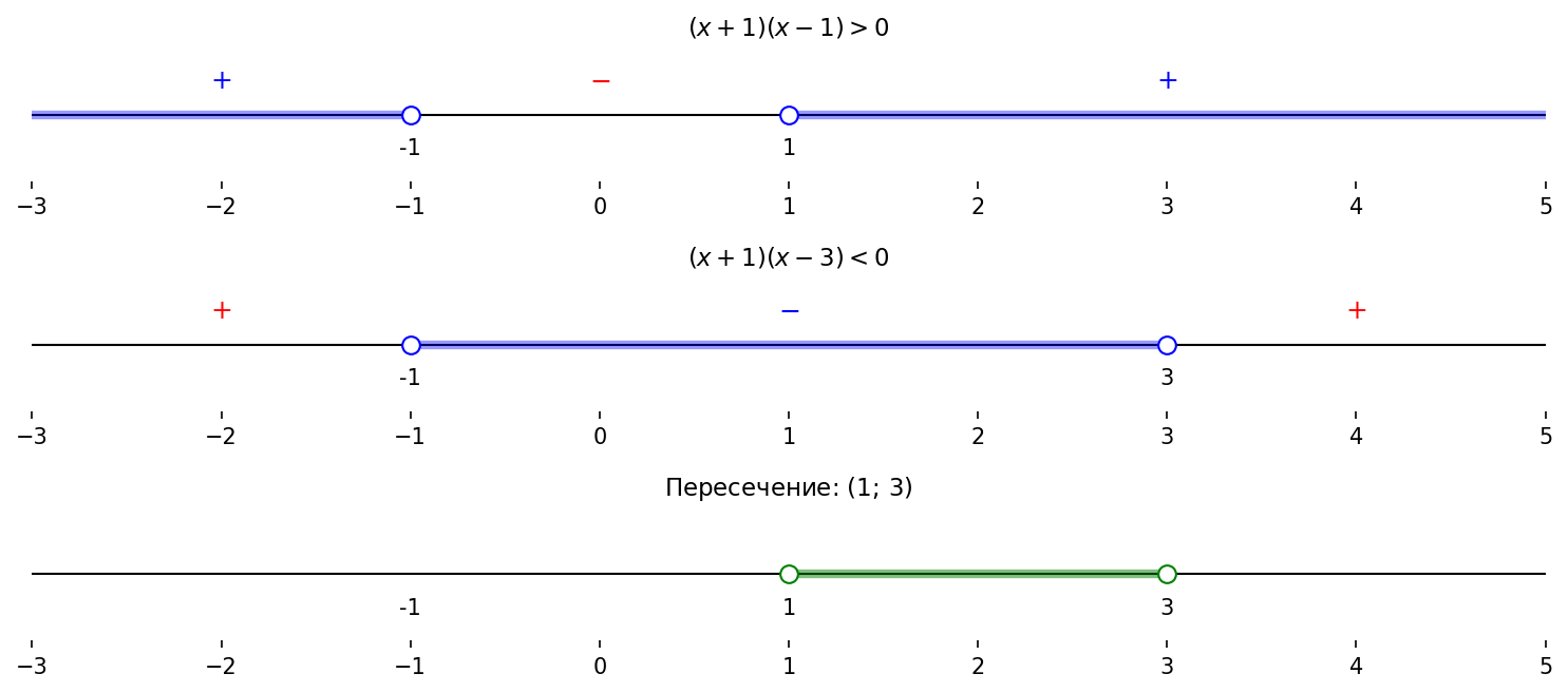 в) $\begin{cases} (x+1)(x-1) > 0, \\ (x+1)(x-3) < 0; \end{cases}$