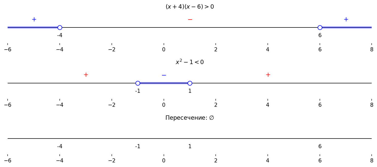 г) $\begin{cases} (x+4)(x-6) > 0, \\ x^2 - 1 < 0. \end{cases}$