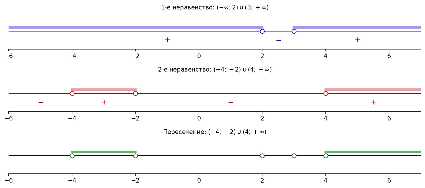 Первое неравенство. Методом интервалов: корни ,