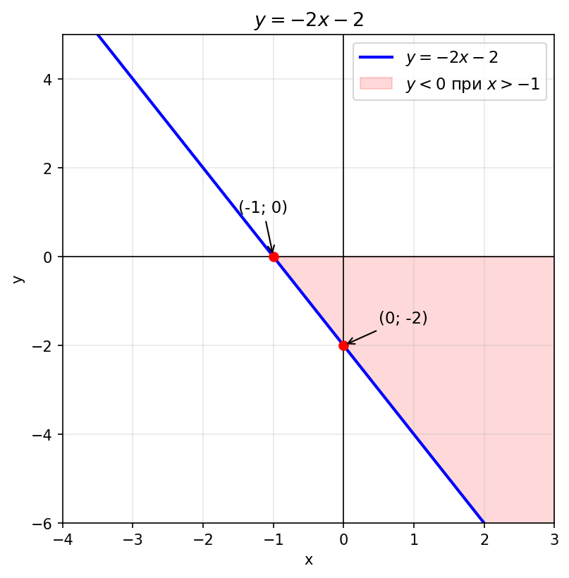 3) Постройте график функции $y = -2x - 2$. Определите интервал, на котором функция принимает отрицательные значения.