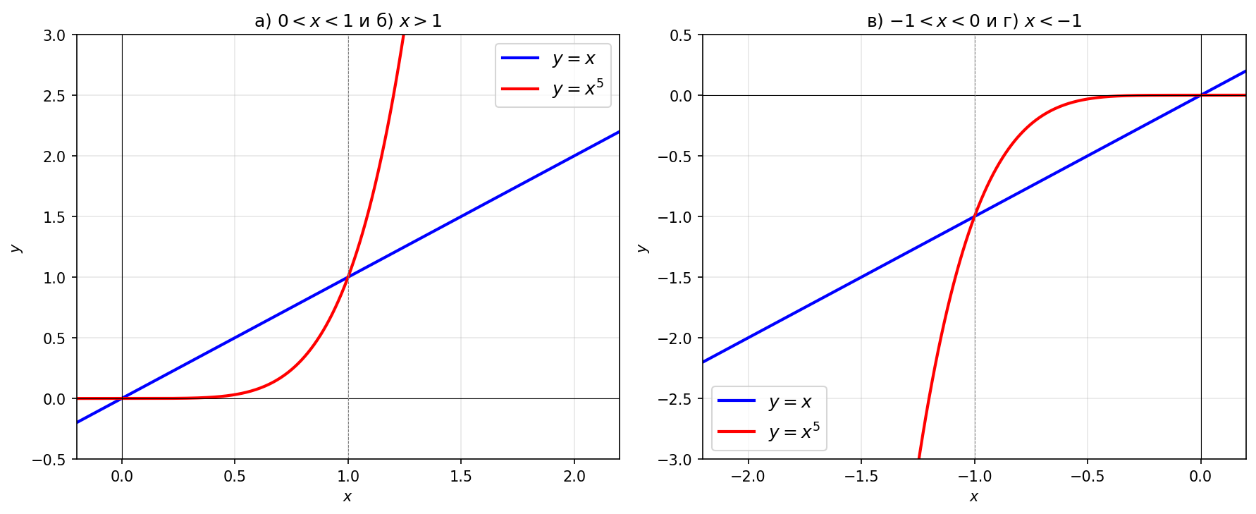 Условие: Сравните значения функций $y = x$ и $y = x^5$ при значениях аргумента: