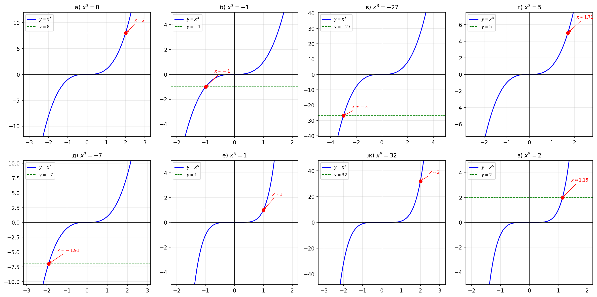 д) $x^3 = -7$; е) $x^5 = 1$; ж) $x^5 = 32$; з) $x^5 = 2$.