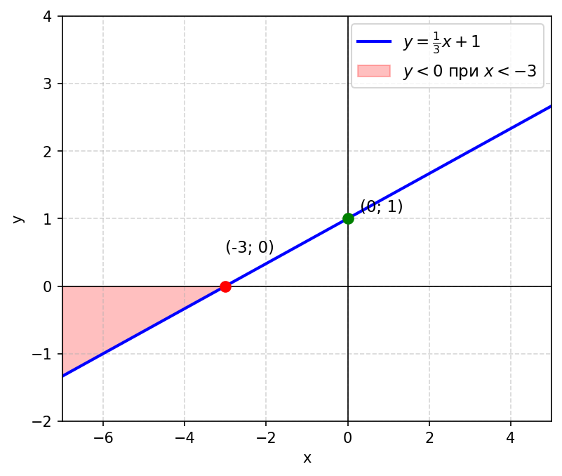 3) Постройте график функции $y = \dfrac{1}{3}x + 1$. Определите, при каких значениях $x$ функция принимает отрицательные значения.