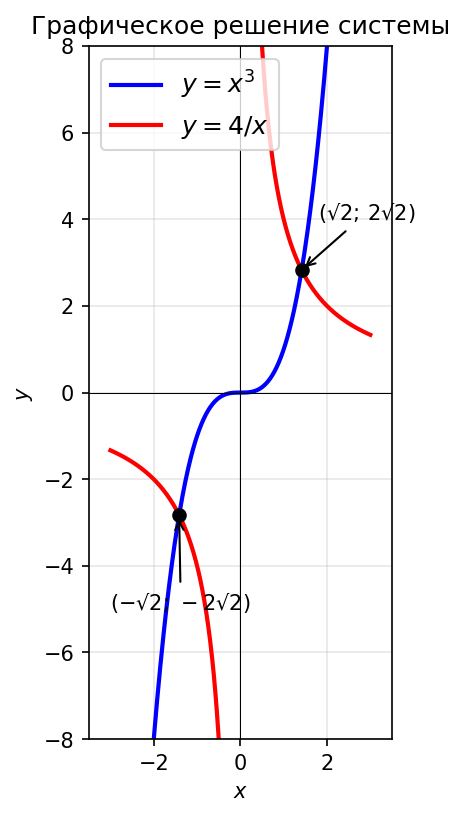 4) С помощью графиков определите, сколько решений имеет система уравнений $$\begin{cases} y = x^3, \\ xy = 4. \end{cases}$$