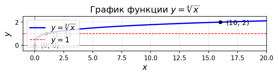 Условие: Постройте график функции $y = \sqrt[4]{x}$. С помощью графика найдите: