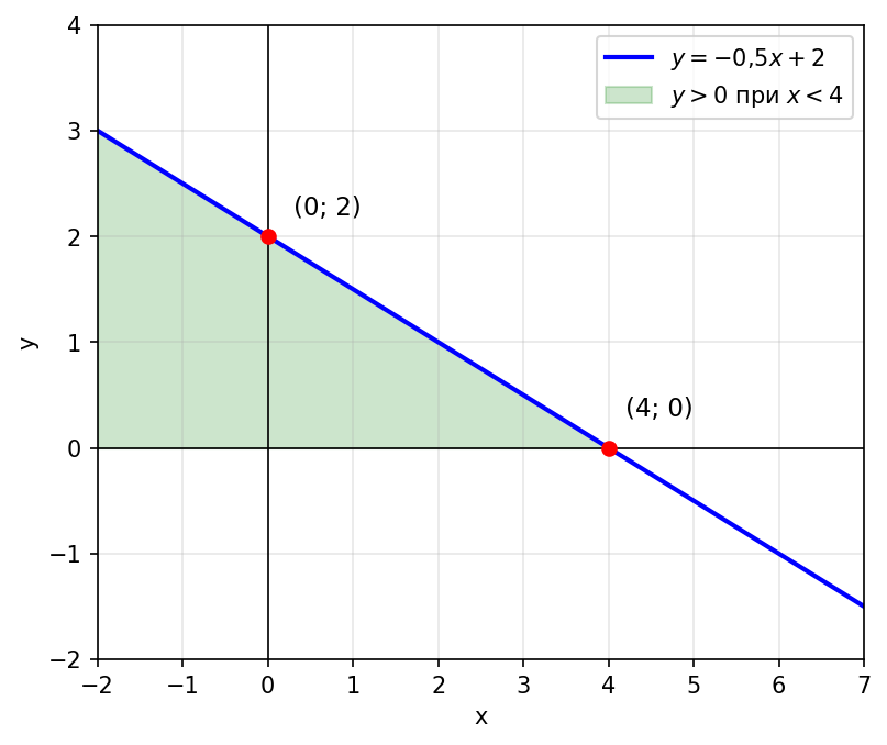 3) Постройте график функции $y = -0{,}5x + 2$. Определите, при каких значениях $x$ функция принимает положительные значения.