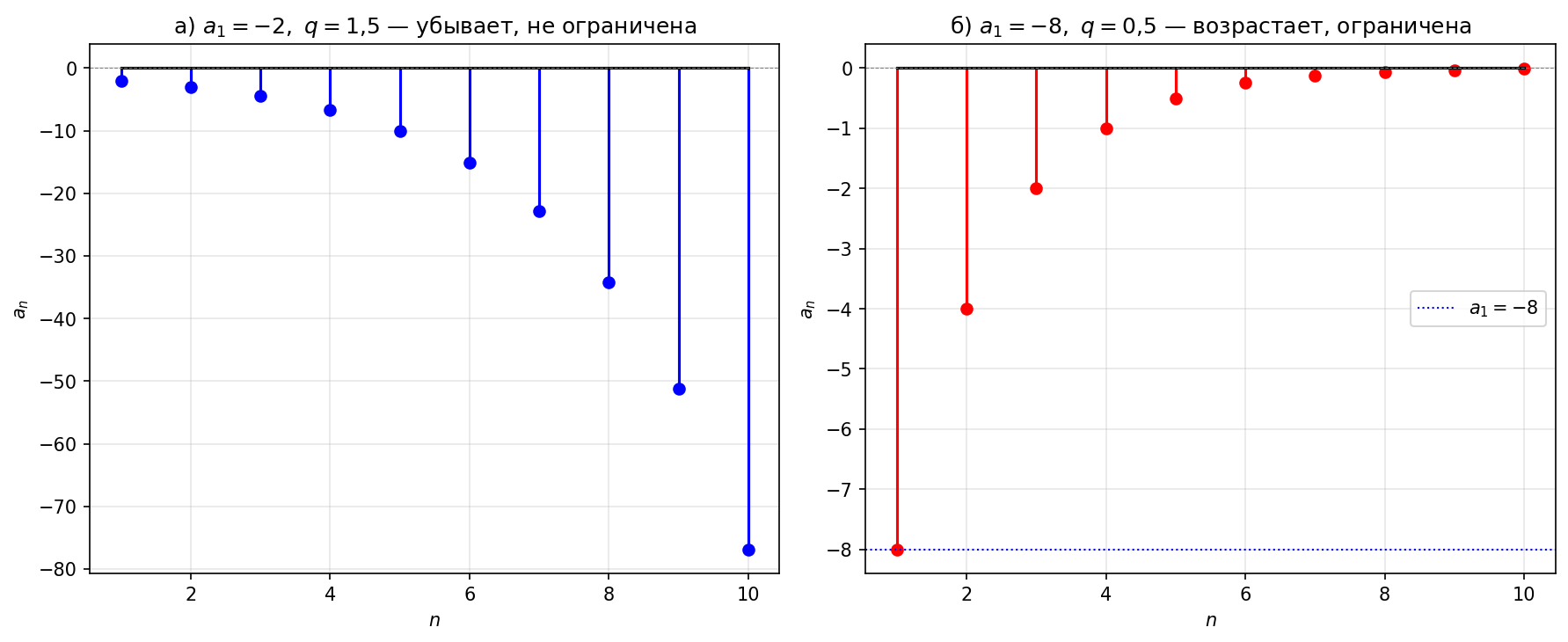 а) если $a_1 < 0$, $q > 1$; б) если $a_1 < 0$, $0 < q < 1$.
